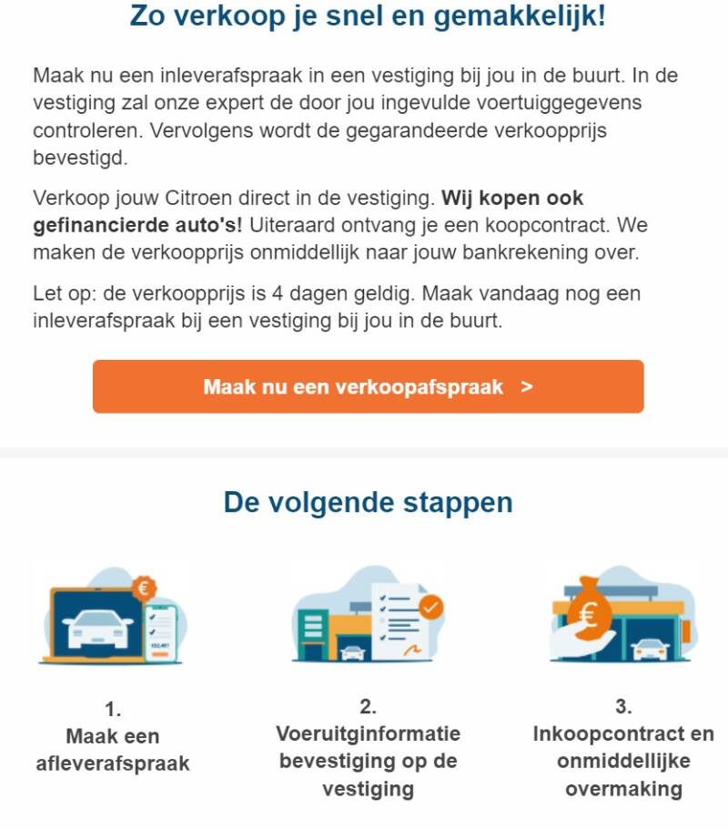 Behalve de aantrekkelijke prijs voor onze auto (3.950 euro), waren de e-mails duidelijk en prettig om te lezen. Er stond duidelijk in vermeld hoe de vervolgstappen zouden plaatsvinden als we besloten onze auto aan hen te verkopen. Precies zoals hierboven beschreven wordt, eigenlijk. Als bewijs daarvoor heb ik hieronder informatie uit de e-mails overgenomen.