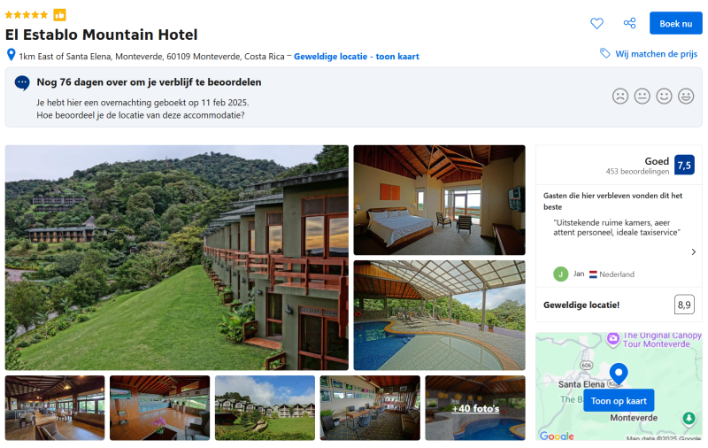 El Establo Mountain Hotel is een praktische keuze voor wie comfort, ruimte en een toplocatie zoekt in Monteverde. Verwacht geen intieme of huiselijke sfeer, maar wel ruime kamers, goed uitgeruste faciliteiten en een uitzicht dat alles goedmaakt.