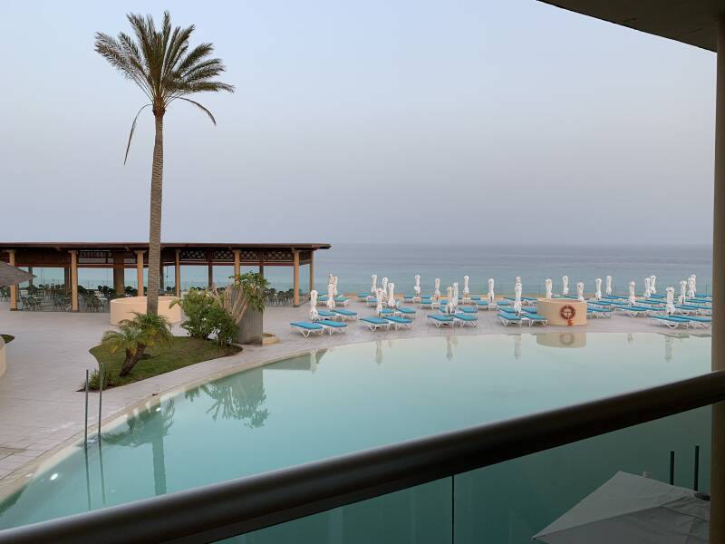 Vlak voor de ingang naar het dorp liggen 3 Iberostar hotels: een 4-sterren hotel, een adults only hotel en een 5-sterren hotel. Iberostar Selection Fuerteventura Palace is een 5-sterrenhotel direct aan zee. Het is een vrij groot hotel met een zwembad dat hoog boven de zee uitsteekt. Voor het strand moet je naar beneden lopen, maar dat is goed te doen. Op het strand staan ligbedden en parasols. Wij waren in de veronderstelling dat die bij het hotel hoorden, maar dat bleek niet zo te zijn. We moesten er gewoon voor betalen.